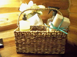 I started with a banana leaf silverware caddy that was on her registry. Then I added some (more fun than usual) kitchen essentials: multipurpose cleaner from JR Watkins, Mrs. Meyer's lemon verbena dish soap, sponges, and dish towels.