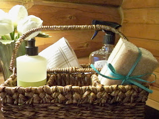 I started with a banana leaf silverware caddy that was on her registry. Then I added some (more fun than usual) kitchen essentials: multipurpose cleaner from JR Watkins, Mrs. Meyer's lemon verbena dish soap, sponges, and dish towels.